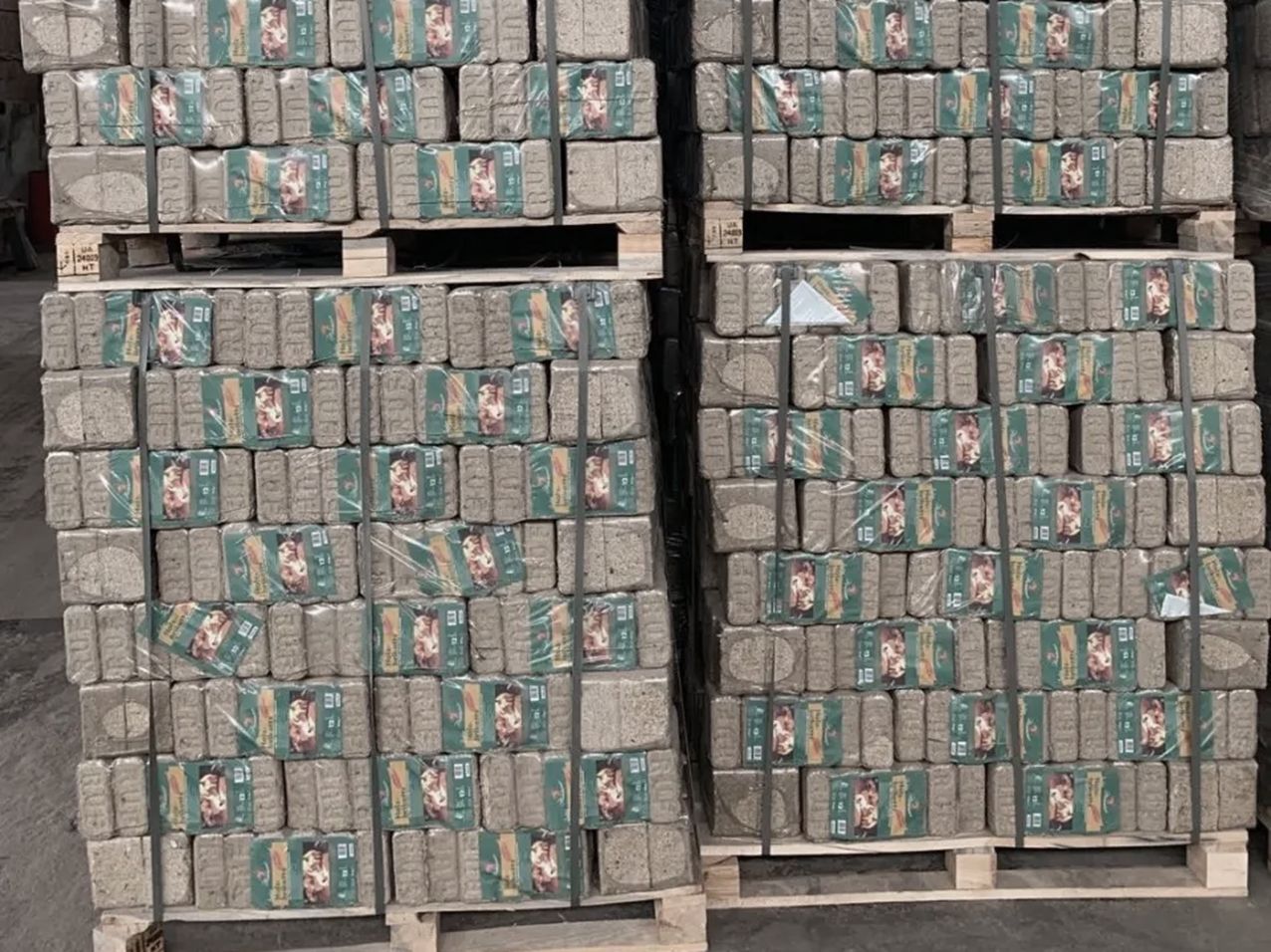Виробляється з деревних відходів і окорених соснових колод, щомісяця пресуємо 1000-1500 т RUF-брикетів. Ми пакуємо їх у невеликі пачки по 12 штук (10 кг) і завантажуємо по 96 пачок на кожну палету.